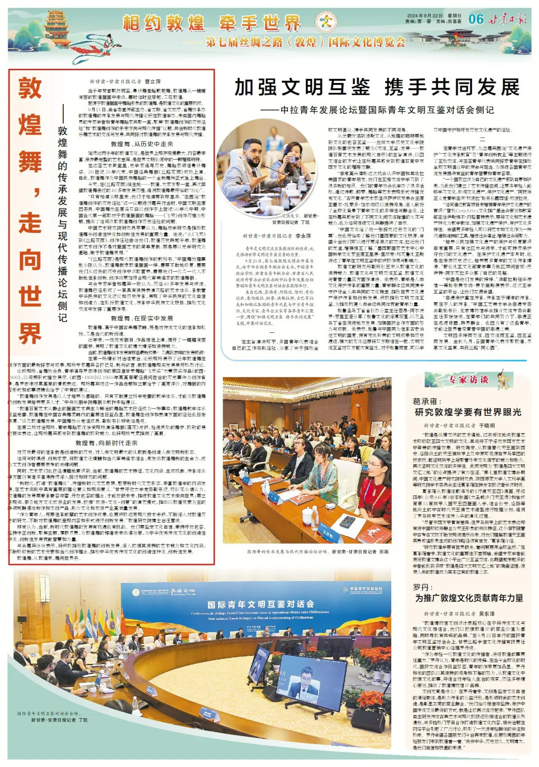 9月21日,由省委宣传部主办,省文联、省文旅厅、省舞协承办的敦煌舞的传承发展与现代传播论坛在敦煌举办,来自国内舞蹈界的专家学者和青年舞蹈家共聚一堂,聚焦“敦煌舞创作的历史经验”和“敦煌舞创作的未来方向与现代传播”议题,共话新时代敦煌乐舞艺术的交流与发展,共同探讨敦煌舞的传承发展与现代传播。